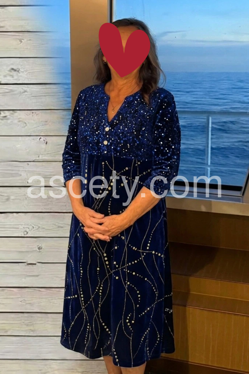 A royal blue and cobalt shade intermingle on this long summer dress covered in white line streaks and dots reminiscent of constellations. A button-front round collar v-neckline, three-quarter length sleeves, and flared midi dress silhouette keep it versatile, finished with side pockets. Pair it with flats, heels, a black or brown leather jacket, and hoops. Machine wash cold tumble dry low to medium heat. Iron if needed or lay flat to dry.